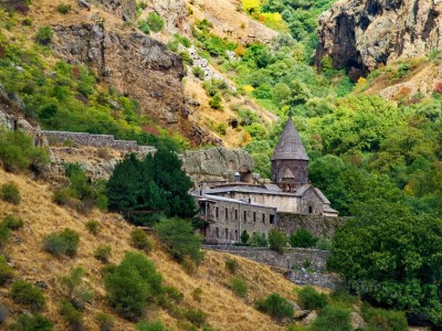 מנזר גרארדמנזר Geghard הממוקם בנוף מדהים של הרים ירוקים ונחל הזורם בקניון תלול.